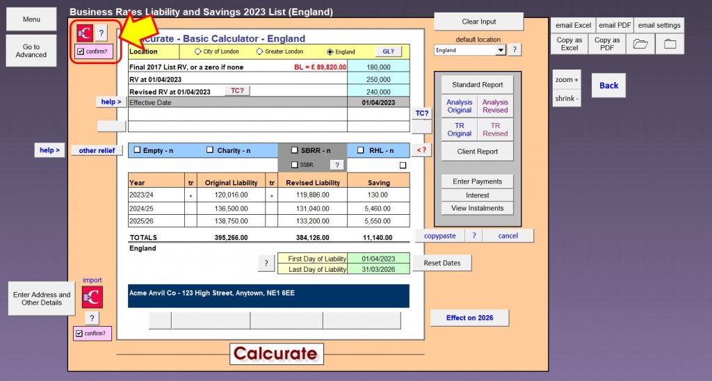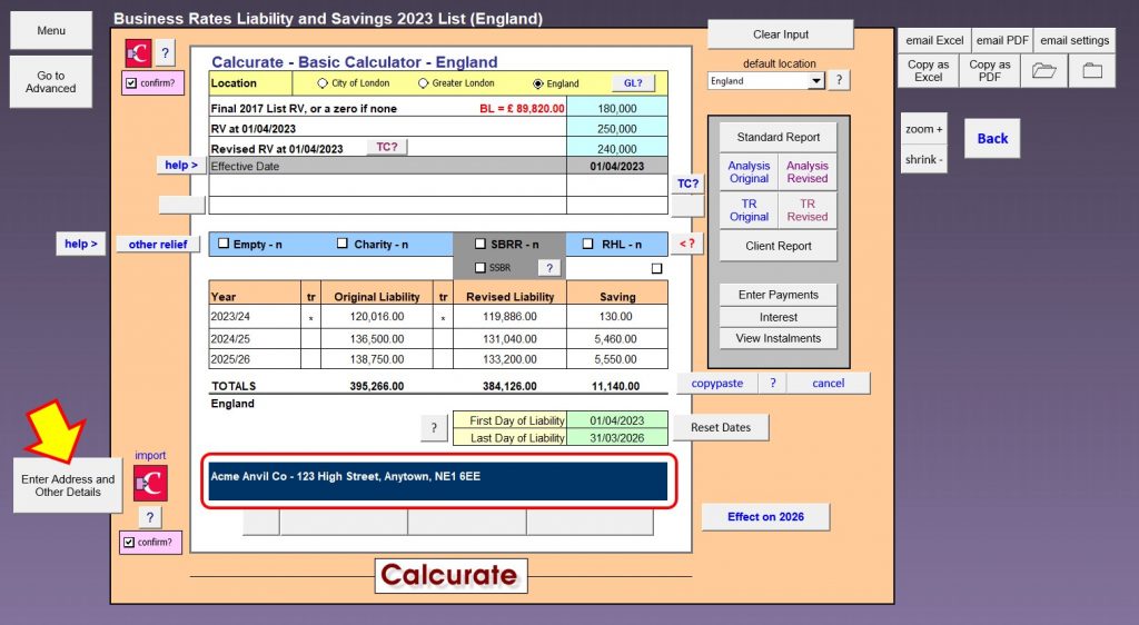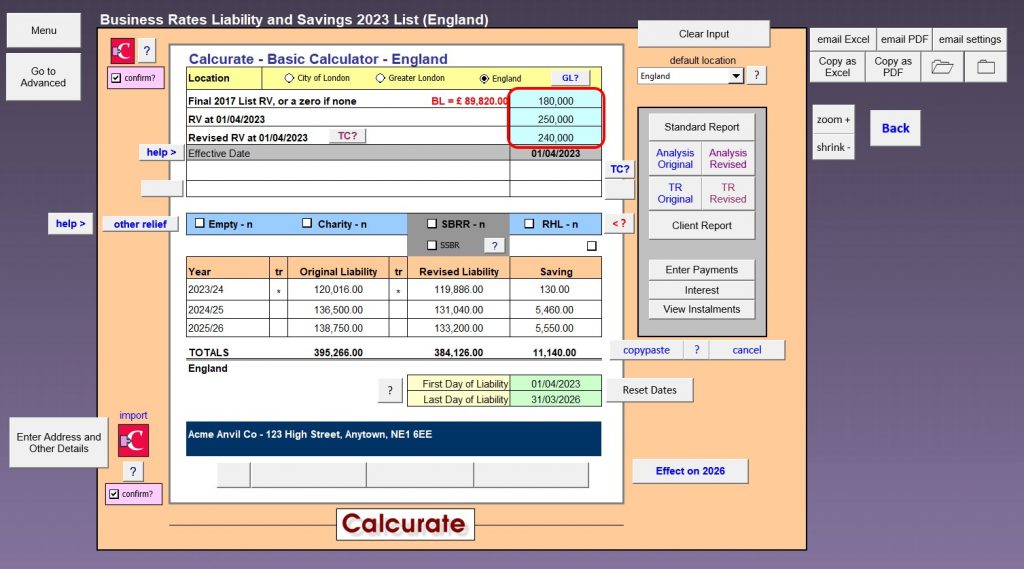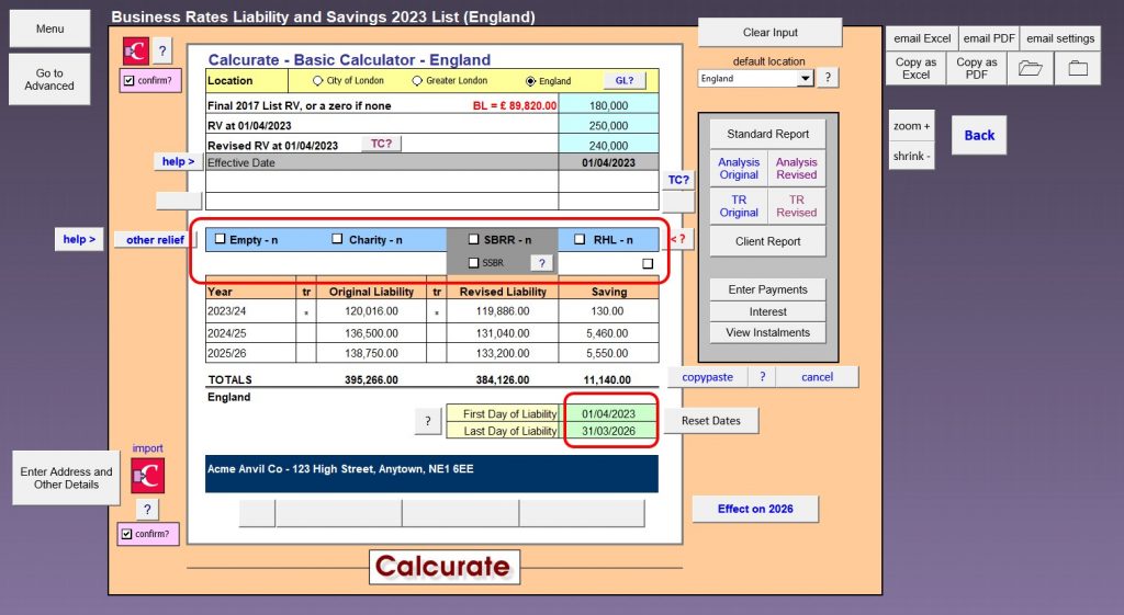 Very quick and easy to use for calculations of liability where the effective date is 1/4/23. Liability can be calculated between any two dates. The figures can be changed from Occupied Rates to Empty Rates at the tick of a box. It can be used where Charitable Relief, Small Business Rate Relief (SBRR), Supporting Small Business Relief (SSBR), Pub Relief, or Local Discretionary Revaluation Relief applies.