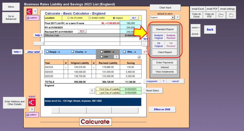 Go to one of the Report Pages to see the details of the Transitional Calculation, a breakdown of the liability, a report for your records, a less detailed report for a client or ratepayer