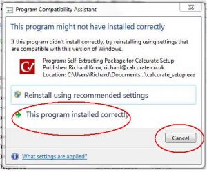 When you first install Calcurate, you may see a warning that “This program might not have installed correctly”. Calcurate WILL have installed correctly so click the message where shown below.